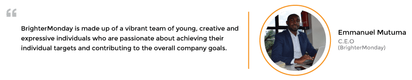 Most people assume that BrighterMonday is another briefcase company. It is in fact, a fully-functioning company that forms part of the One Africa Media Group and operates Africa’s largest portfolio of online marketplaces. The company has all the traits of a typical company including a CEO, and departments like Sales, Finance, Marketing, Operations, Design and Customer Service. The clear-cut difference that makes BrighterMonday stand out is its culture.